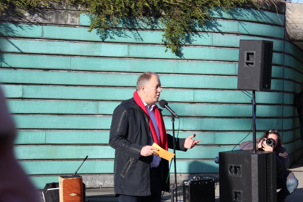 Achim Dietrich, Betriebsratsvorsitzender der ZF Friedrichshafen und Mitglied der baden-württembergischen Verhandlungskommission der IG Metall rief den Versammelten zu: "Mit diesem Bild im Kopf und Eurer Unterstützung im Rücken fahre ich jetzt nach Böblingen. Den Arbeitgebern muss klar sein: Wenn sich heute nichts bewegt kommen wir wieder", und erntete dafür großen Zuspruch.